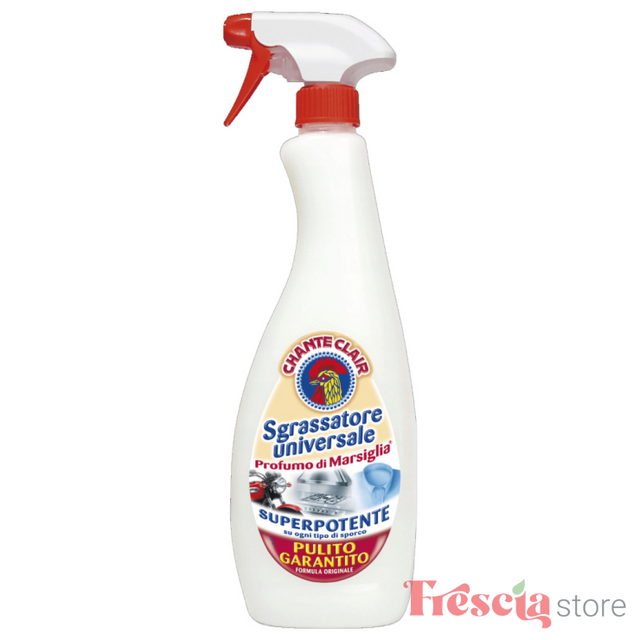 Chanteclair Sgrassatore Universale Profumo di Marsiglia este un degresant universal superputernic, eficient împotriva tuturor tipurilor de murdărie grasă și pete dificile. Formula sa originală, îmbogățită cu parfumul clasic al săpunului de Marsilia, îl face ideal pentru utilizare în bucătărie, baie, pe suprafețe lavabile, precum și ca pre-tratament pentru petele de pe țesături. Pulverizatorul său special permite utilizarea produsului chiar și cu susul în jos, facilitând accesul la zonele greu accesibile și asigurând utilizarea până la ultima picătură.