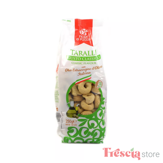 Taralli clasici crocanti, preparati dupa traditie din regiunea Puglia cu faina de grau, vin alb si ulei de masline extravirgin (2%). Gust autentic italian, perfecta pentru aperitiv si degustari cu vin rosu si branzeturi.