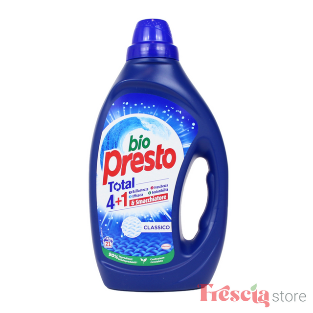 Bio Presto Detersivo Liquido Total 4+1 Bucato Lavatrice Classico 21 Lavaggi este un detergent lichid pentru rufe, potrivit pentru spalarea automata a hainelor. Formula sa eficienta asigura curatarea profunda a tesaturilor, indepartand petele si oferind prospetime hainelor. Flaconul de 1.04 litri este suficient pentru 21 de spalari.